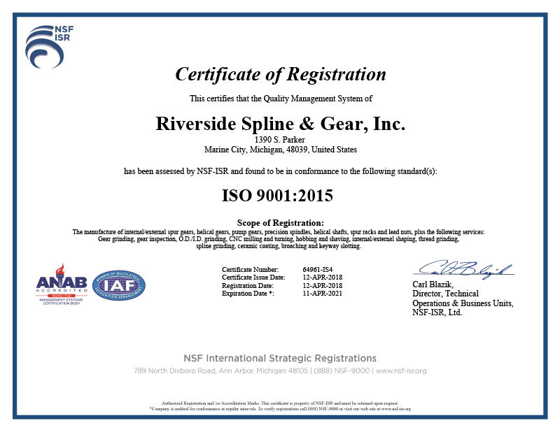 Riverside Spline & Gear, Inc. is proud to announce that we have achieved registration in accordance with the requirements of ISO9001:2015.
